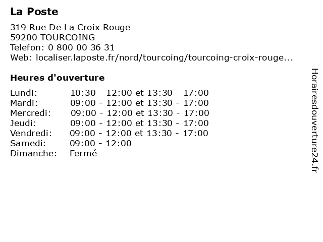 09h00 - 12h00 13h30 - 17h00 Open Today. Horaires douverture de La Poste Tourcoing Croix Rouge. Je souhaite simuler un. Les horaires laffranchissement ainsi que la levée du courrier à la Poste Tourcoing Croix Rouge dans le département du Nord 59 Service le La Poste. Horaires et heures limites de dépôt de La Poste TOURCOING CROIX ROUGE 59200.
