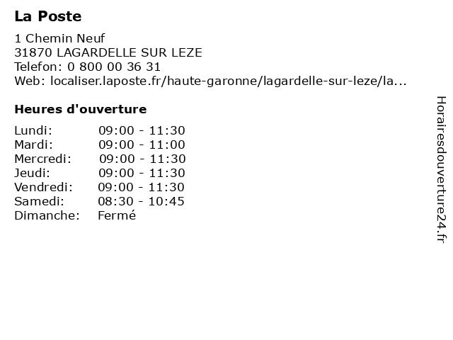 La Poste Lagardelle Sur Leze - 1 Chemin Neuf 31870 Lagardelle Sur Leze - Horaires numéro de téléphone et toutes les coordonnées de lagence postale. Adresse photos retrouvez les coordonnées et informations sur le professionnel. Vous cherchez les coordonnées téléphoniques dun bureau de Poste ou un renseignement. La Poste Noé. La Poste Muret Le Barry.