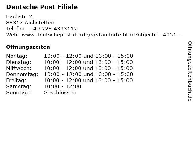 Deutsche Post Filiale Postfiliale Xaver Gnädinger Bahnhof 2 in Leutkirch Im Allgäu. Sa 0900 - 1200. Bahnhof 2 88299 Leutkirch im Allgäu. Sehen Sie sich für zusätzliche Informationen auch die Blöcke verkaufsoffener Abend und verkaufsoffener Sonntag an. Wir bieten Informationen wie Öffnungszeiten genaue Standort und Anfahrtsplan von jedes Posts.